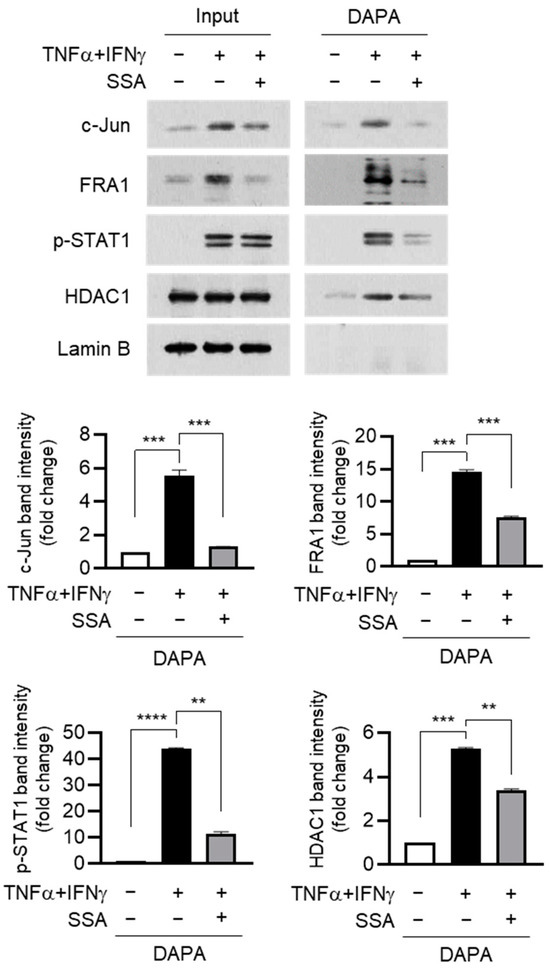 TNFα + IFNγ stimulation suppresses FLG expression by promoting the FRA1:c-JUN:HDAC1:p-STAT1 complex, and IFNγ-induced p-STAT1 was required to recruit HDAC1 to the repressor complex [12]. The effect of SSA on the DNA binding affinity of these proteins was determined using a DNA affinity precipitation assay (DAPA). Pretreatment with SSA decreased the expression of FRA1 and c-Jun in the nucleus (input), thereby reducing the DNA binding of FRA1, c-Jun, p-STAT1, and HDAC1 (Figure 6). These findings suggest that SSA restores FLG expression by repressing the expression of FRA1 and c-Jun, thus preventing the recruitment of the repressor complex to the FLG promoter.