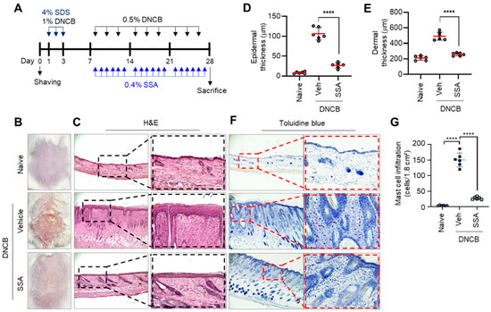 Effect of SSA on the amelioration of DNCB-induced AD-like skin lesions in BALB/c mice. (A) Experimental schedule to induce atopic dermatitis (AD)-like skin lesions. DNCB, dinitrochlorobenzene. (B) Representative images of the back skin of BALB/c mice photographed on day 28: naïve, DNCB + vehicle (70% ethanol); DNCB + SSA (0.4%). (C) H&E, hematoxylin and eosin staining. Epidermal thickness (D) and dermal thickness (E) were measured using ImageJ version 1.52a software. The infiltration of inflammatory cells was analyzed using toluidine blue staining (F). The number of permeabilized cells was quantified graphically by counting per area (G). Scale bars, 200 μm. The data are presented in the form of mean ± SD (n = 6). **** p < 0.0001. SDS, sodium dodecyl sulfate; DNCB, 2,4-dinitrochlorobenzene; SSA, saikosaponin A; Veh, vehicle.