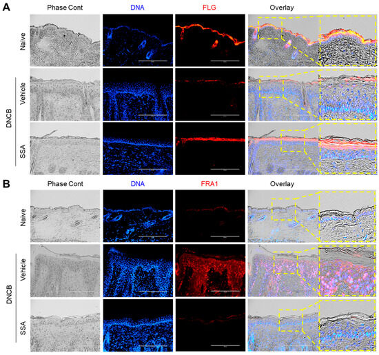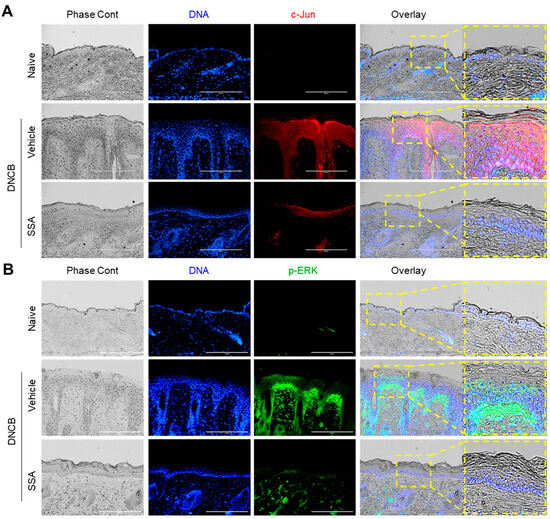 Suppression of FLG expression is a well-documented feature in DNCB-induced AD-like mouse skin [12,14]; hence, the FLG reduction was examined in AD-like skin lesions by immunofluorescence staining. FLG expression was reduced in the DNCB-challenged group, which was rescued by the topical application of SSA (Figure 9A). The expressions of FRA1 (Figure 9B), c-Jun (Figure 10A), and p-ERK (Figure 10B) were intensified in the DNCB-treated dorsal skin compared with that in the vehicle-treated group. Conversely, SSA significantly reduced the stained forms of these proteins. These results demonstrate that SSA effectively recovers impaired FLG expression in vivo in DNCB-induced AD-like skin inflammation by suppressing FRA1, c-Jun, and p-ERK expression.