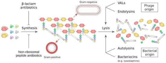 Antimicrobial agents acting on the bacterial cell wall. Classic antibiotics, low-molecular-weight compounds, and non-ribosomal peptides interfere with peptidoglycan synthesis, which is the main building material of the bacterial cell wall. The peptidoglycan layer in Gram-positive bacteria is thick and exposed to the outer environment. In contrast, in Gram-negative bacteria, the peptidoglycan layer is considerably thinner and covered by an outer membrane, which limits the penetration of antimicrobial agents, particularly those with high molecular weight. High-molecular-weight agents are proteinaceous and may be divided into two groups: lysins of phage origin (virion-associated lysins [VALs] and endolysins) and enzymes of bacterial origin (autolysins and bacteriocins). These antimicrobial agents are responsible for the enzymatic lysis of the bacterial cell wall.
