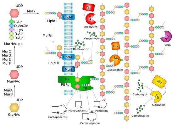 AMI—amidase domain; CBD—cell-wall-binding domain; CDD—Conserved Domain Database; CHAP—cysteine/histidine-dependent amidohydrolase/peptidase domain; EAD—enzymatically active domain; ESBLs—extended-spectrum β-lactamases; FnBPs—fibronectin-binding proteins; GBCs—biosynthetic gene clusters; GH—glycosidase domain; GlcNAc—N-acetylglucosamine; GLUCO—glucosaminidase domain; GPAs—glycopeptide antibiotics; LEDGOs—lytic enzyme domains grouped by organism; LYSO—phage-lysozyme domain; Lys–Sp222—lysostaphin from S. pseudintermedius; Lys–Ss—lysostaphin from S. simulans; MBLs—metallo-β-lactamases; m-DAP—meso-diaminopimelate; MDR—multidrug-resistant; MIC—minimal inhibitory concentration; MRSA—methicillin-resistant S. aureus; MSSA—methicillin-sensitive S. aureus; MURA—muramidase domain; MurNAc—N-acetylmuramic acid; NLPC/P60—new lipoprotein C from E. coli and protein of 60 kDa of Listeria monocytogenes domain; PBPs—penicillin-binding proteins; PDB—Protein Data Bank; PEG—polyethylene glycol; PET-M23—peptidase domain M23; PG—peptidoglycan; PGHs—peptidoglycan hydrolases; PP—propeptide; SBD—spore-binding domain; SBLs—serine-β-lactamases; SCCmec—staphylococcal cassette chromosome mec; SH3b—Src homology 3 bacterial domain; SLT—soluble lytic transglycosylase domain; SP—signal peptide; TAL—tail-associated lysins; TAME—tail-associated muralytic enzymes; TG—transglycosylase; TP—transpeptidase; TRANG—transglycosylase domain; UDP—uridine diphosphate; Und-P—undecaprenyl phosphate lipid carrier; VALs—virion-associated lysins; VAPGHs—virion-associated peptidoglycan hydrolases; VRSA—vancomycin-resistant S. aureus; WHO—World Health Organization.