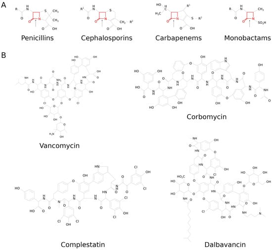 The structural formulas of the cell-wall-targeting antibiotics. (A) The structures of the cores of β-lactam antibiotics. The β-lactam ring is colored in red. The bond hydrolyzed by β-lactamases is marked with an arrow. R, R1, and R2, variable functional groups. (B) The structural formulas of exemplary glycopeptide antibiotics.