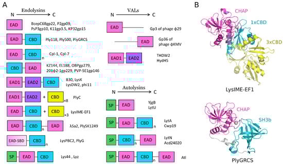 The vast majority of VALs do not have recognizable CBDs. The presence of this domain is, however, dispensable because the contact between VAL and cell wall PG substrate is guaranteed by the interaction of other phage proteins and host–cell surface receptors []. Although VALs act on PG ‘from without’ and endolysins ‘from within’, EADs of VALs share a high degree of amino acid similarity to endolysins’ EADs, suggesting a similar mode of action in cleavage mechanisms and hydrolyzing specific and highly conserved bonds in murein [,]. The majority of VALs have a single lytic domain fused to the phage capsid structural protein, which can be located at the N-terminus (Gp3 of phage φ29) or C-terminus (Gp36 of phage φKMV) (Figure 5A) []. The most common EADs in VALs exhibit glycosidase and endopeptidase activities []. However, in phages infecting Gram-positive bacteria, there are also VALs carrying two catalytic domains with distinct cleavage specificities [,]. For example, S. aureus phage DW2 has a VAL THDW2, with an N-terminus CHAP domain followed by a muramidase. Interestingly, the phage also encodes bifunctional LysDW2 endolysin with CHAP and amidase activity [].