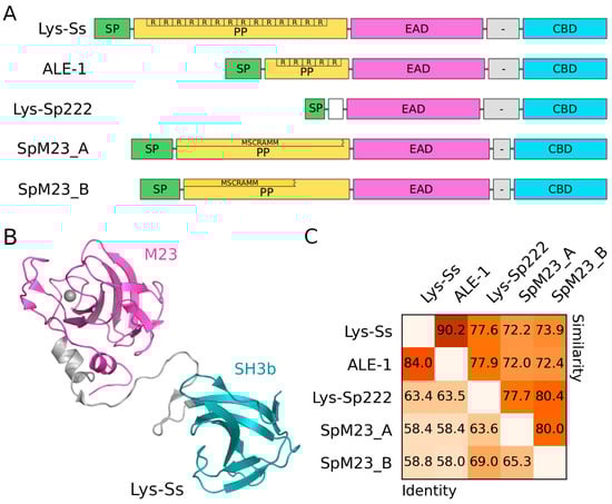 Structure and similarity of staphylococcal lysostaphins. (A) The most common lysostaphin architecture includes an N-terminal signal peptide (SP) followed by a propeptide (PP), which contains short 13-amino-acid-long repeats (R) or a putative MSCRAMM domain. The essential part of each lysostaphin comprises an enzymatically active domain and a cell-wall-binding domain, separated by a short linker (EAD–CBD). (B) The molecular structure of the mature form of Lys–Ss includes the EAD and CBD domains (M23-SH3b), with a Zn2+ ion located within the M23 metalloproteinase domain, depicted as a gray sphere. The coloring corresponds to the first panel. PDB ID: 4LXC. (C) Sequence identity and similarity of the EAD–CBD regions among known staphylococcal lysostaphins. Lys–Ss and ALE-1 sequences are highly similar, while sequence similarity among other lysostaphins is moderate. SP, signal peptide; PP, propeptide; R, repeat; EAD, enzymatically active domain; CBD, cell-wall-binding domain.