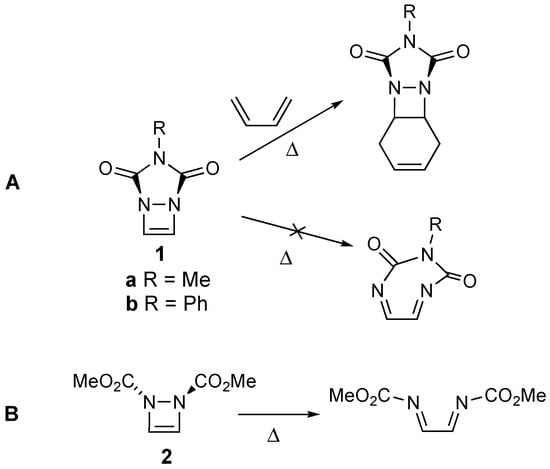 (A) Reactivity of diazetine 1 via Diels–Alder reactions to form 1,2-diazetidines, and its resistance to electrocyclic ring opening; (B) Thermally allowed electrocyclic ring opening of diazetine 2.