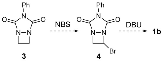 Having finally obtained 3, we were free to pursue its free-radical bromination in pursuit of compound 4 (see Scheme 2). However, unfortunately, the bromination of this substrate proved difficult. Using standard bromination conditions (NBS, benzoyl peroxide, and heat [13]) upwards of 30% (estimated based on the 1H NMR spectrum) of the desired compound 4 could be formed based on the observation of chemical shifts consistent with the anticipated structure. In particular, the singlet representing the four methylene protons for compound 3 was transformed into three individual multiplets at 6.29 (CH-Br), 5.12, and 4.61 ppm, which was consistent with monobromination. In addition, conducting a 13C NMR experiment revealed two different saturated carbons (64.0 and 61.4 ppm) instead of the single carbon observed for compound 3 (51.6 ppm). The signal at 64.0 ppm was determined to be a CH carbon and the signal at 61.4 ppm was determined as a CH2 carbon by a DEPT experiment. However, unfortunately, attempts at further bromination did not appear to increase the yield and instead led to the formation of complex product mixtures. This was surprising since we expected that the nitrogen atom within the urazole ring would stabilize the radical intermediate formed during the bromination process and, thereby, promote the reaction [14]. However, in this case, it appears to have the opposite effect. Therefore, given the number of steps required to form 3, in addition to the reluctance of 3 to cleanly brominate to form 4, we felt it prudent to abandon this route towards the synthesis of diazetine 1b. However, other synthetic pathways are currently being pursued in our labs.