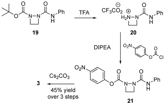 It was interesting that these cyclizations failed even though compound 13 could be formed from precursor compound 12. We surmised that the reason for the failure of the ring closure of 17 and 18 may be due to the rigidity of the urazole ring structure. The rigidity of the ring structure might inhibit the intramolecular nucleophilic attack that is necessary to form 3. Therefore, we worked out a new alternative synthetic scheme that would install the urazole ring structure after the cyclization process (see Scheme 6). Hence, starting with an already intact diazetidine compound 19 that had been previously reported by Shipman [7], we removed the BOC group with TFA. The treatment of the resulting crude trifluoroacetate salt 20 with 4-nitrophenyl chloroformate in the presence of the base diisopropylethylamine afforded 21. Crude 21 was then successfully cyclized with Cs2(CO3)2 to afford the desired diazetidine 3 as a white solid in 45% yield over three steps. The melting point of this compound, 173–174 °C, was much more in line with what would be expected.