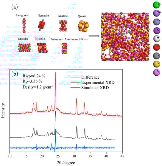 The XRD data of FA were analyzed using HighScore Plus software, and the first seven main minerals with the highest content were selected to establish the initial cell model for each mineral. In Materials Studio 19.1.0.1740 (MS) software, the initial unit cell model was transformed into a nonperiodic structure, and the amorphous cell (AC) module was used to mix the mineral content in the refined results to establish an amorphous model of FA with different densities. Then, the simulated XRD data of the amorphous model with the experimental XRD data were compared using the Reflex Refinement module, and the variance of the graph fitting was calculated. When Rwp [35] and Rp were less than 15%, the XRD main peak of the simulated structure of the FA was consistent with the XRD experimental value of the FA for the amorphous structure. This indicates that the simulated structure is close to the real structure.