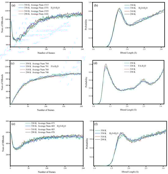 Figure 6a,c,e show the number of hydrogen bonds at 298 K, 318 K, 338 K, and 358 K, respectively. In the temperature range of 298–358 K, there was little effect on the formation of hydrogen bonds in the FA-H2O system. Comparing Figure 6a,e, S-FA inhibited the formation of hydrogen bonds between water molecules and water molecules in the nearby water molecular layer, which reduced the boiling point and viscosity of the whole system. Figure 6d shows the distribution of the hydrogen bond length between the FA surface and water molecules. The adsorption of water molecules on the FA surface resulted in the formation of hydrogen bonds with lengths ranging from 1.5 to 2.5 Å. The corresponding hydrogen bond became stronger with decreasing bond length, increasing the viscosity of the FA surface [28], which made it easier for FA to agglomerate in the water system. The agglomerates played a role in coating water molecules, which led to a further increase in water absorption. Figure 6g shows the distribution of hydrogen bonds between and within SA molecules. At 338 K, the distribution of hydrogen bonds with a bond length of 1.5–2.5 Å decreased, and the formation of intramolecular hydrogen bonds of SA affected the grafting of SA molecules on the surface of FA [29]. As shown in Figure 5g, intramolecular hydrogen bonds were formed after SA was closed, and this closed-loop effect may hide the carboxyl group (-COOH). Therefore, 338 K was considered as the optimal temperature for SA grafting on the surface of FA.