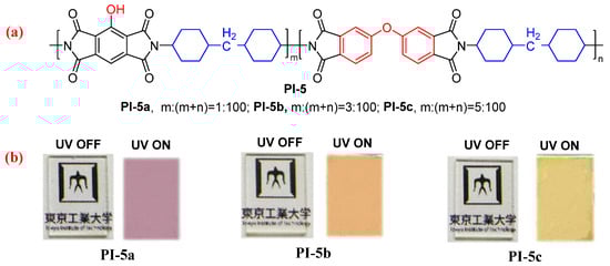 As stated above, the formation of aggregates of hydroxyl-containing PMDA-based dianhydride moiety is unfavorable for improving the fluorescence quantum efficiency of PIs. In order to solve this problem of an aggregate formation of hydroxyl-containing PMDA-based dianhydride moiety, Ando et al. [36] continually synthesized a copolyimide (PI-5, Figure 4) using the hydroxyl-containing PMDA and ODPA dianhydrides, in which the hydroxyl-containing PMDA molar ratio was controlled at less than 5%. The PI-5 films demonstrated much higher ΦPL value (0.20 for PI-5a and PI-5b, 0.23 for PI-5c) than that of the homo-PI film (0.09 for PI-1d, 0.068 for PI-4 [35]), which is due to the efficient energy transfer for ODPA and the suppressed aggregation by copolymerization.
