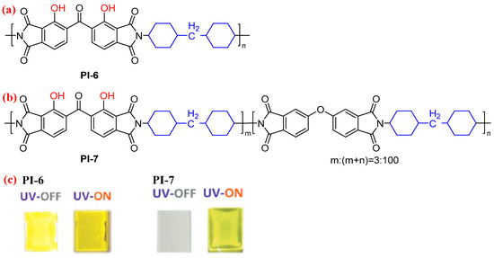 The chemical structures of (a) PI-6 and (b) PI-7. (c) Photos of PI-6 and PI-7 films under sunlight and UV light. Adapted with permission from Ref. [31]. Copyright 2021, Royal Society of Chemistry.
