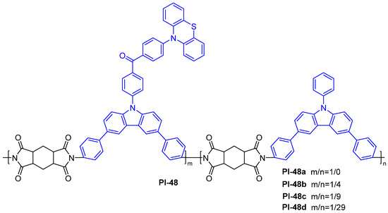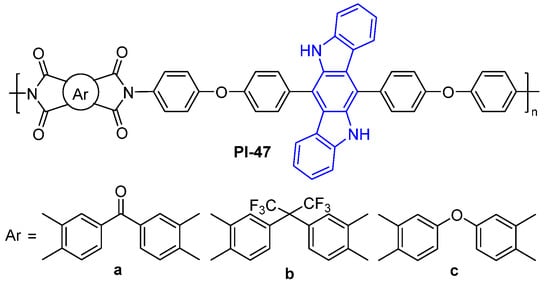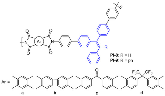 For example, Zhang et al. designed and synthesized a series of high-performance functional aromatic PIs containing the TriPE (PI-8, Figure 6) [39] and TetraPE (PI-9, Figure 6) moieties [40] in diamine fragments. Thanks to the rigid nonplanar conjugated structure of the MPE structure, the intra- or/and intermolecular CT effects of PI-8 and PI-9 were effectively inhibited, resulting in the as-obtained PI showing fluorescence characteristics in the NMP solution and film state. Combining with other outstanding properties, such as low dielectric constant (k), light color, high glass transition temperatures (Tg, more than 350 °C), high thermal stability, and excellent mechanical properties, these functional PIs show attractive potential applications in the field of high-performance flexible polymer photoconductive devices.