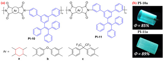 The fluorescence efficiency of the abovementioned aromatic PIs containing the MPE-based diamine fragment is relatively low due to the overall conjugation of the aromatic polymer chain. Therefore, Zhang et al. [41] continued to design two TetraPE-based diamine monomers, which were reacted with an aliphatic dianhydride 1,2,4,5-cyclohexanetetrcarboxylic dianhydride (HPMDA) to obtain two semiaromatic PIs with larger twisted side groups (PI-10a and PI-11a, Figure 7a). The intra- and intermolecular CT effects of the semiaromatic PIs were more effectively inhibited, and, thanks to the AIE performance of the TetraPE unit, the PI-10a and PI-11a films exhibited outstanding fluorescent characteristics with high absolute ΦPL values of up to 89% for PI-11a (Figure 7b). However, the fully aromatic PI (PI-10b-c and PI-11b-c) films were of faint PL emission with absolute ΦPL value lower than 4.8%. The authors demonstrated by theoretical calculation studies that these phenomena ascribed to the highly fluorescent AIE luminogen did not make contributions to the fluorescence intensity of fully aromatic PI films. Moreover, PI-10a and PI-11a also exhibit excellent thermal properties, such as high Tg (398 °C for PI-10a, 291 °C for PI-11a) and thermal decomposition temperature (Td) values (above 530 °C) and low CTE (below 50 μm·m−1·°C−1). The authors’ current experiment provided controllable ways for preparing high-thermal-stability polymeric materials with efficient fluorescence characteristics.