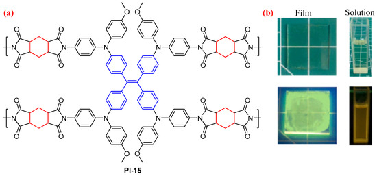 Guan et al. [44] sequentially designed and prepared a hyperbranched fluorescent TetraPE-based PI (PI-15, Figure 10). The twisted TetraPE core and semiaromatic dianhydride could inhibit the CT effect. Therefore, the THF solution of PI-15 revealed a light-yellow fluorescence at 535 nm with a ΦPL value of 2.2%. The PL emission of PI-15 was enhanced in the solid film with an absolute ΦPL value of 4.7%, because PI-15 has the AIE property by introducing the TetraPE structure.