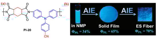 Liou et al. [55] introduced an electron-withdrawing cyano group into the TPA-based diamine monomer (CN-TPA) and constructed a semiaromatic PI (PI-20, Figure 13a). The resulting PI-20 exhibited a blue PL emission at 443 nm with an absolute ΦPL value of 34% in the NMP solution. Notably, the PL emission of PI-20 is greatly enhanced in the solid film with an absolute ΦPL value of 65%, which could be further enhanced in the form of electrospun (ES) fiber with an absolute ΦPL value of 70% (Figure 13b). These phenomena could be attributed to the AIE effect resulting from the introduction of the CN-TPA luminogen. These results demonstrate that the incorporation of the CN-TPA luminogen into high-performance polymers is a feasible approach to prepare efficient luminescent materials for optoelectronic applications.
