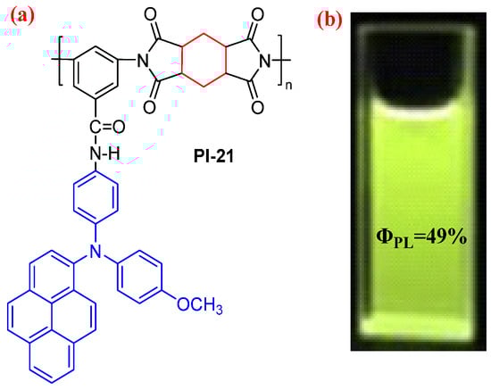 The ingenious introduction of the bulky pendant TAA-based fluorescent group into the PI side chain is also a useful way to construct the high-fluorescent PI. For example, Zhao et al. [56] prepared a fluorescent semiaromatic PI (PI-21, Figure 14a) by introducing the diphenylamine-pyrene unit into the PI side chain. The PI-21 presented a bright fluorescence emission at 541 nm with an absolute ΦPL value of 49% in the NMP solution (Figure 14b). The high fluorescence efficiency of PI-21 is due to the bulky pendant diphenylamine-pyrene in the PI side chain loosening the packing and aliphatic dianhydride structure, reducing the CT effect.