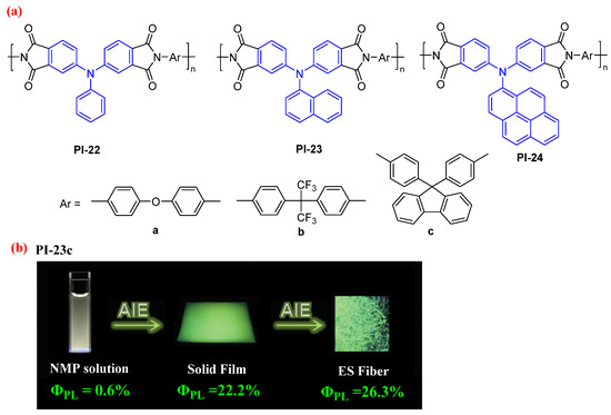 For example, Liou et al. [57] prepared a series of fully aromatic PIs from the synthesized TAA-based dianhydrides (Figure 15a). As shown in Figure 15b, due to the AIE feature of TAA derivatives, these PIs exhibited weak yellowish-green PL emissions in NMP solutions with absolute ΦPL values of 0.3–1.2% and high PL emissions in the solid state with absolute ΦPL values up to 22% (PI-23c), which could be further enhanced in the form of ES fiber with the highest ΦPL values of 26% (PI-23c). These results demonstrate that the incorporation of the TAA luminogen with an AIE feature as a dianhydride is an outstanding approaching to obtain the solid-state high-efficiency PL wholly aromatic functional PIs, which are desirable candidate materials for advanced optoelectronic applications.