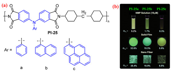 Subsequently, Liou et al. [58] replaced the aromatic diamine monomers with the aliphatic diamine monomer to prepared a series of the semiaromatic PI (PI-25) using the above-synthesized TAA-based dianhydride monomers. Compared to the fully aromatic TAA-based PI, the CT effect of the semiaromatic TAA-based PI is more suppressed, resulting in the higher fluorescence efficiency of the semiaromatic PI. The ΦPL values of PI-25 were improved to 5.2%, 32.6%, and 35.4% in the NMP solution, solid film, and nanofiber states, compared to those of the fully aromatic TPA-based PIs of below 1.2%, 22.2%, and 26.3%, respectively (Figure 16b) [57].