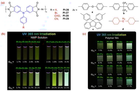 Liou et al. [59] also prepared the fluorescent PIs (PI-26-29, Figure 17a) from TPA-based dianhydride monomers containing different substituted groups (-H, -Br, -CHO, and -CN) with various diamine monomers. The authors also found that the fully aromatic PIs, which have a relatively extensive CT effect, displayed lower ΦPL than did the semiaromatic PIs (Figure 17b,c). In addition, PI-28 and PI-29 containing the strong electron acceptor (-CHO and -CN) showed higher ΦPL in the NMP solution than did PI-26 and PI-27 (Figure 17b); however, in the film state, the ΦPL values of PI-28 and PI-29 were observed to be similar to those of PI-26 and PI-27 (Figure 17c). The hybridized local and charge-transfer transitions could be enhanced by introducing the strong electron acceptor into the TPA luminogens to exhibit higher ΦPL in the solution state, but also by facilitating intermolecular CT and energy transfer interactions in the solid film state, which leads to the ACQ effect and results in lower ΦPL. These fluorescent PIs have great potential for high-performance optoelectronic applications.