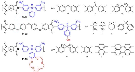 For example, Damaceanu et al. synthesized a series of fluorescent triphenylmethane-based (TPM-based) PIs with the pendant phenyl [63] (PI-31) or hydroxyl-functionalized phenyl [64] (PI-32) in the TPM core (Figure 19). However, due to the low conjugation of a single pendant phenyl, these TPM-based PI systems exhibited weak fluorescence in the solution phase and no fluorescence in the film state. Then, the authors synthesized the TPM-based PI functionalized group with benzo-15-crown-5 ether in the pendant phenyl of the TPM core (PI-33, Figure 19) [65]. Due to a ground-state intermolecular CT complex between the donor-crown-ether modified TPM diamine and the acceptor diimide segment, these PIs displayed strong light emission in the green to yellow spectral range in the THF solution. Moreover, since crown ethers can be complexed with metal ions, these PIs can serve as fluorescent sensors for the detection of cations like Li+, Na+, and K+.