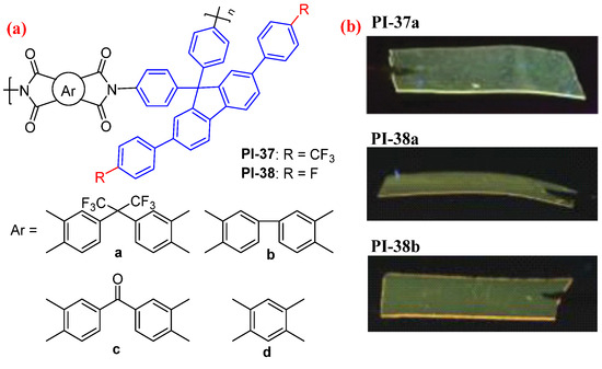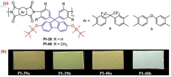 Our group synthesized a series of fluorene-based PIs with tert-butyldimethylsiloxy (TBS) side groups (PI-39 and PI-40, Figure 24a) by a direct silyl ether reaction of fluorene-based cardo-PI-containing OH groups [70]. When the electron-donating -OH groups in the PI chains are replaced with bulky TBS groups, the intermolecular attraction forces (hydrogen bonding) and the molecular chain stacking are reduced; thus, the interchain CT effect of the PI-39 and PI-40 can be partly depressed. In contrast with hydroxyl-containing fluorene-based cardo PI films with no fluorescent characteristic, these PI-39 and PI-40 films exhibit bright fluorescence at 466–526 nm with ΦPL values of 3.5–4.8%. In addition, these PI films still possess excellent thermal properties with a Tg of 311.2–338.9 °C, a light color with high optical transparence (over 80% at 450 nm), and a low dielectric constant (as low as 2.44 at 1 MHz for PI-40a). This work provides a convenient way to prepare multifunctional PI films with excellent overall properties, which shows the high potential applications of these PI films in microelectronic, electric, and photonics industries.