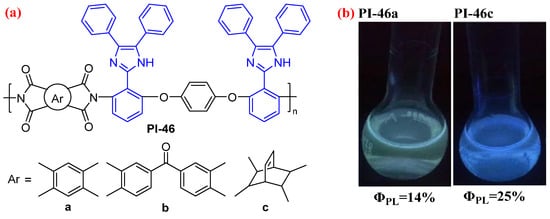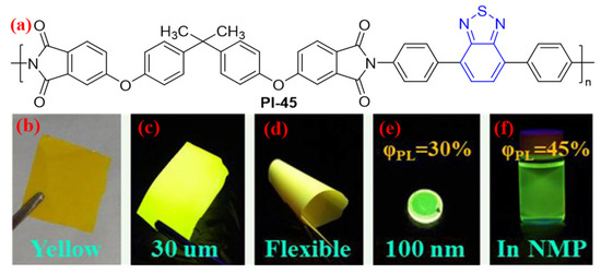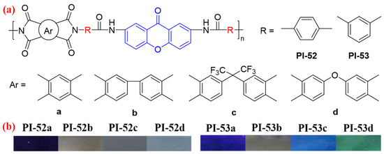 The fluorescence efficiency of semiaromatic PIs derived from TPA-based dianhydride is higher than that of the aromatic PI from the same dianhydride. However, the aliphatic diamine structure in these TPA-based PIs reduced Tg. In order to develop fluorescent aromatic PIs with high fluorescence efficiency and high Tg, Liou et al. [60] prepared three aromatic PIs derived from TPA-based dianhydride containing three methyl groups and methyl-substituent p-phenylenediamine (PI-30b–d, Figure 18a). Introducing methyl groups into TPA-based dianhydride and p-phenylenediamine to form a bulky and highly twisted conformation efficiently hindered π–π stacking and reduced the intermolecular CT effect of the resulting aromatic PIs. The fluorescence efficiency of these aromatic PIs was increased with an increased number of methyl groups in the diamine (Figure 18b). Among these aromatic PIs, the PI-30b exhibited the highest ΦPL, up to 53% in the solution state and 61% in the film state, which was similar to that of the semiaromatic PI-30a derived from the same dianhydride and alicyclic diamine (55% in the solution state and 61% in the film state). The authors speculated that the tetramethyl-substituted p-phenylenediamine can effectively suppress intramolecular CT by playing the role of the aliphatic unit. In addition, these aromatic PIs exhibited extremely high Tg (above 400 °C); in particular, PI-30b exhibited the highest Tg, to 470 °C.
