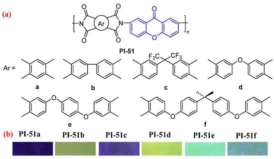 Often, fluorophores are introduced in the polymer chain to endow the fluorescence characteristics of polymer materials. However, the traditional aromatic PIs containing fluorophores show weak or no fluorescent characteristic due to the fluorescence quenching caused by reabsorption through the strong inter- and intramolecular CT effect in the aromatic PI chain [37]. Suppressing the CT effect in aromatic PIs is an effective method to improve the fluorescence quantum efficiency of aromatic PIs. Based on this, more and more fluorescent aromatic PIs created by appropriately controlling the electron push–pull effect between the aromatic diamine moieties and the dianhydride moieties have been reported.