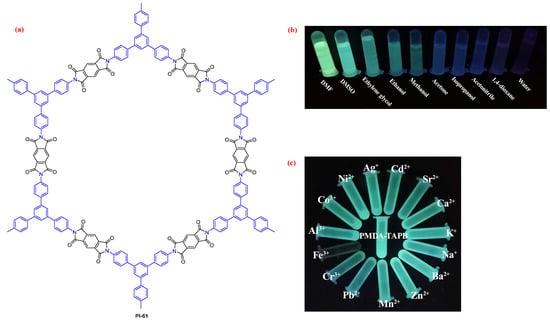 - Zhao, N.; Liu, J.-M.; Yang, F.-E.; Lv, S.-W.; Wang, J.; Wang, S. Easy Green Construction of a Universal Sensing Platform Based on Crystalline Polyimide Covalent Organic Frameworks with Sensitive Fluorescence Response to Metal Ions and Antibiotics. ACS Appl. Bio Mater. 2020, 4, 995–1002. [Google Scholar] [CrossRef]