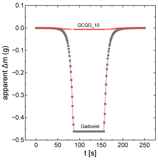 Figure 1 shows the apparent mass changes in the samples of gadobutrol and solution GCQD_10 as a function of the measurement of time. The apparent mass changes are directly proportional to the magnetic properties of the system. As already mentioned, gadovist apparently has much stronger magnetic properties. However, after taking into account the degree of dilution, GCQD_10 interacts more strongly with the magnetic field.
