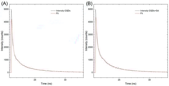 The results of the excited-state lifetime measurements are presented in Figure 3, which shows two kinetic decay curves, labeled A and B, corresponding to CQDs and GCQDs_10, respectively. Although there is practically no difference in the shape of the curves, the decay curve for CQDs exhibits a faster decline. This observation suggests that the presence of gadolinium in GCQDs_10 influences the excited-state dynamics.