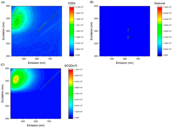 Next, fluorescence analyses of both samples were conducted. Figure 4 presents the excitation vs. fluorescence map for gadovist, CQDs, and GCQDs_10.