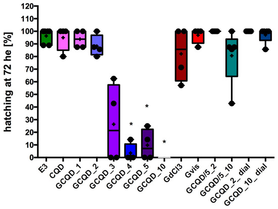 Hatchability of Danio embryos after 72 h of exposure to the tested substances. Mean (marked with “+”) ± standard deviation (SD, box), median (marked with a line), whiskers indicate minimum and maximum values, n = 4–6 (total embryos 36–54 per group); Kruskal–Wallis test, Dunn’s post hoc, differences vs. control (only E3) were considered at p < 0.05 (*). E3—buffer for embryos, CQD—quantum carbon dots, GCQD—gadolinium carbon quantum dots, GdCl3—gadolinium chloride, Gdvis—gadobutrol.