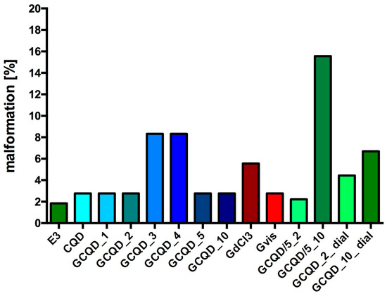 In this study, after zebrafish embryos were exposed to GCQDs (Carbon:Gadolinium atomic ratio: 100:1, 100:2, 100:3, 100:4, 100:5, 100:10, 20:2, 20:10, 100:2 after dialysis, 100:10 after dialysis) their mortality was not statistically significantly different than the mortality of embryo from the control group and accounted for not more than 31%. In most groups, the survival average was about 80%, which was comparable to the survival calculated after exposure to GdCl3 or gadobutrol. It should be noted that mortality did not increase with exposure time in any group, practically, all embryos that survived the first 24 h survived until the end of the experiment, i.e., up to 76 hpf. Then, in most groups, most of the larvae after 72 he developed physiologically, no malformations were observed in them, and the percentage of disorders was calculated at a level below 5–10. In only one group (GCQD/5_10) it was at 16%.