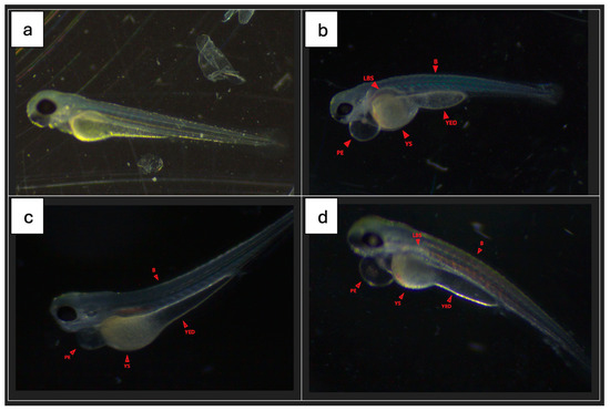 Sample photos of selected fish without and with characteristic malformations. E3 group (a), GCQD_3 group (b), GCQD_5 group (c,d). B—bent spine; YED—yolk extension; YS—yolk sac edema; PE—pericardial edema; LSB—lack of swim bladder. Zoom applied 40×.