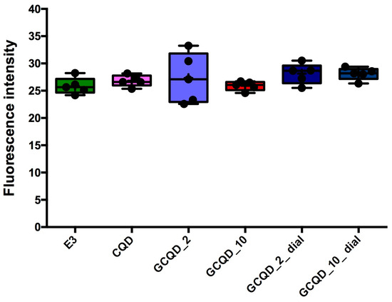 Fluorescence intensity of zebrafish larvae in blue light (4 dpf). Mean (marked with “+”) ± standard deviation (SD, box), median (marked with a line), whiskers indicate minimum and maximum values, n = 5; Kruskal–Wallis test, Dunn’s post hoc. E3—buffer for embryos, CQD—quantum carbon dots, GCQD—gadolinium carbon quantum dots, GdCl3—gadolinium chloride.