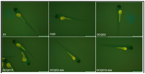 The zebrafish embryos were exposed to the GCQDs for 4–76 hpf. They were kept in 24-well plates with three embryos per well containing 1 mL of the solution. The plates were covered with plastic lids to prevent evaporation. The GCQDs solutions were renewed every 24 h. Mortality, hatching, and morphology were assessed and recorded using a CCD digital camera (DP70, Olympus, Tokyo, Japan) mounted on a microscope (Stemi 305, ZEISS, Oberkochen, Germany) every 24 h from 4 hpf to 76 hpf.