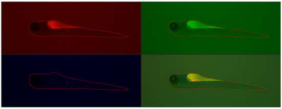 Next, the larvae (72 he) were washed three times with the E3 culture medium, anesthetized using 0.1 mg/mL MS-222 (Sigma-Aldrich, Darmstadt, Germany), and then they were visualized with a Leica DMI8 fluorescence inverted microscope (Leica Microsystems GmbH, Wetzlar, Germany). The images were captured with a digital Leica DFC450 CCD camera and Leica DMI8-CS inverted fluorescence microscope (Leica Microsystems GmbH, Wetzlar, Germany). All images were captured with the same settings (condenser: BF; exposure time: 324.951 ms; gain: 10; format 1920 × 1440 pixels; objective: 2.5). No correction was applied to the images. Assays were carried out to evaluate any changes compared to control larvae. Larval fluorescence intensity was calculated using Fiji software 2.15.1 (ImageJ2, GitHub, San Francisco, CA, USA), an open-source platform for biological-image analysis [42]. We calculated the fluorescence signal intensity by marking regions of interest (ROI) on the body surface of each larva fish and comparing it to the background signal (n = 5). Figure 13 shows example images from the analysis of the fluorescence signal.