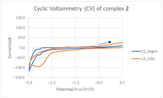Fragment of cyclic voltammogram of complex 2 (5·10−4 M, glassy carbon working electrode dish with 3.0 mm diameter, dry MeCN, 0.1 M Bu4NPF6, scan rate 100 mV·s−1), recorded under argon atmosphere (blue line) and CO2 atmosphere (orange line). The arrow indicates the scan direction. The complete cyclic voltammogram can be seen in Figure S5 of the Supplementary Materials.