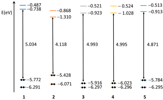 The following supporting information can be downloaded at: https://www.mdpi.com/1420-3049/29/17/4081/s1, Figures S1–S3: intermolecular interactions in the crystal structure; Figures S4–S8: Cyclic voltammograms of complexes 1–5; Figures S9–S12: energy levels and frontier molecular orbitals of complexes 1, 3–5; Table S1: Composition of the molecular orbitals for complexes 1–5; Figures S13–S16; 1H and 13C NMR spectra for complexes 2–5.
