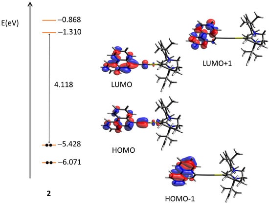 DFT calculations were performed in order to obtain a better understanding of the electronic structure of these complexes (see Section 3 for details). Table 2 gathers some calculated structural values of the optimized structure for complex 2 in its ground state (S0), which showed only positive frequencies, and the comparison with the experimental XRD values, showing a good agreement between the structural parameters, validating the level of theory. Figure 3 shows the energy levels of the frontier molecular orbitals (FMOs) for all complexes. For complexes 1–5, both the highest occupied molecular orbital (HOMO) and the LUMO are mainly located on the aryl-alkynyl fragment, with some small participation of the metal center, as can be seen in Figure 4 and Figures S9–S12 and Table S1. This topology of the LUMO indicates that the entry of the electron in the reduction process occurs mainly on this fragment. The high value of the energy of the LUMO in complex 1 correlates well with the high value of the reduction potential for complex 1 [,,,].