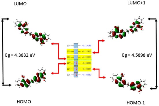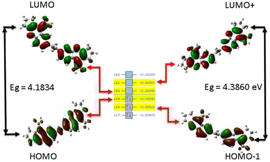 Predictions based on the electronic structure theory for 4a and 4b tetrahydroacridines were completed using the density functional theory (DFT) method. Geometry optimization of the structure was performed on model structures and outputs used for further geometry optimization. The highest occupied molecular orbital (HOMO), and the lowest unoccupied molecular orbital (LUMO), which are the orbitals that constitute the frontier molecular orbitals (FMO), were energetically evaluated to comprehend the nature of reactivity and stability of the studied compounds according to previous studies [92]. All FMO (HOMO and LUMO given in Table 1) isosurface maps were plotted. Starting from their calculated energy values, quantum reactivity parameters were calculated: chemical potential (µ), ionization potential (I), electron affinity (A), electronegativity (χ), hardness (η), softness (σ), as listed in Table 1. Also, from the FMOs analysis, the energy gap (Eg) value was obtained as the difference between the HOMO and LUMO energy levels. The results are shown in Figure 5 and Figure 6 for 4a and 4b, respectively, and agree with other studies [93]. A higher Eg value signifies more stability and less reactivity, while a low Eg value indicates less stability and high reactivity [94].