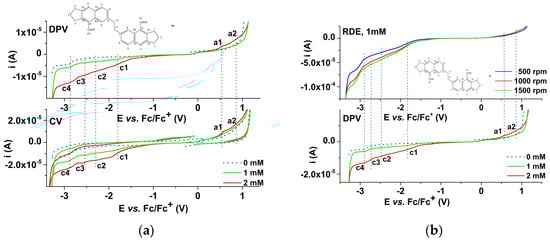 In the case of 4a, from Figure 7 relating to different concentrations of 4a the anodic and cathodic currents (continuous lines) are higher than those for the supporting electrolyte (dashed lines) and increase with the concentration of 4a. This shows that 4a undergoes oxidation and electrochemical reduction processes. There are two main anodic processes denoted by a1 and a2 (Figure 7a). In the cathodic DPV scans, four peaks were noticed (denoted c1–c4 in Figure 7a). From Figure 7b, processes a1 and a2 in DPV do not correspond to a wave in RDE at any rotation rate of the electrode. On the other hand, in the cathodic domain, it is clearly observed that the RDE curve has limiting currents that increase with the rotation rate of the electrode. They have been studied in detail and will be discussed further. The parallel presentation of the DPV curves and the RDE curves obtained at different concentrations of 4a at a rotation rate of 1000 rpm and the RDE curves obtained for the concentration of 1 mM and 2 mM at different rotation rates of the electrode illustrate the difference between the information provided by these methods (anodic processes appear only in DPV, while cathodic ones are revealed by both methods).