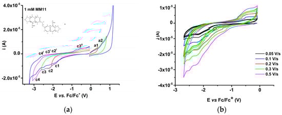 In Figure 14a, the CV curves for 4b are given over different anodic and cathodic potential domains, to check the reversibility of the electrochemical processes highlighted for 4b. All anodic and cathodic processes are irreversible for compound 4b, having no corresponding peaks in the return sweeps. This irreversibility may be due to oxidation or reduction processes with the formation of films on the electrode surface. This behavior was tested by recording CV curves at different scan rates (between 0.05 and 0.5 V/s) (Figure 14b). The variation of the anodic and cathodic currents with the scan rate and the square root of the scan rate, respectively, was examined for 4b. The slopes of the correlation lines and the linear correlation coefficients are displayed in Table 6. For the correlations examined for processes a1-a3 and c1, it is seen that the dependence of the current on the square root of the scan rate has a better correlation coefficient than the dependence on the scan rate, which may imply a diffusive behavior at the potentials examined.
