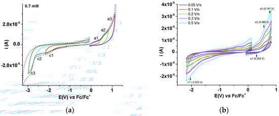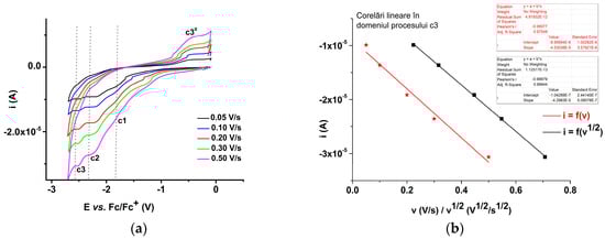 For the first cathodic scans (Figure 9a), the values of the peak currents in the c3 process domain were represented as a function of the scan rate (I vs. v) or the square root of the scan rate (I vs. v1/2) (Figure 9b). The correlation of the current intensity with v1/2 is better, justifying a possible diffusive process in reduction.