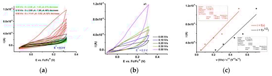 In Figure 8a, the CV curves are given on various potential domains, anodic and cathodic, which allow the evaluation of the reversibility of the highlighted electrochemical processes, which take place at different potentials. It is observed that anodic processes are irreversible, having no correspondence in the return sweep. These oxidation processes can lead to the formation of films on the surface of the electrode and have been further analyzed because they occur relatively easily (at moderate anodic potentials close to 0.6 and 0.9 V, potentials at which peaks were recorded on the DPV curves). The presence in the CV curve of the processes c2′, c3′, and c4′ highlighted at the return sweep after the cathodic scan shows that they are quasi-reversible (Figure 8a). This behavior was verified by recording CV curves at different sweep rates (between 0.05 and 0.5 V/s) in several successive cycles for each scan rate, as in Figure 8b.