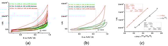 CV curves in the first anodic scans at variable scan rates (a), CV curves in the first anodic scan at variable scan rates (b), and the dependence of current intensity at 0.6 V from the 1st cycle of the CV curves on the scan rate (red line and points) or on the square root of the scan rate (black line and points) (c) for [4a] = 1 mM.