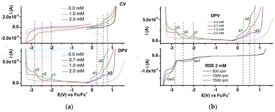 The electrochemical behavior of 4b is illustrated in Figure 13a, where the CV and DPV curves for the 4b solutions are shown in parallel at different concentrations, evidencing by both methods that 4b undergoes electrochemical oxidation and reduction processes. In Figure 13b, DPV curves are compared with RDE curves (obtained at different rotation rates for the highest concentration studied) to make the connection between the processes evidenced by these methods. The DPV peak potentials are given in Table 5. There are three main anodic processes denoted with a1–a3 and three cathodic peaks (denoted c1–c3) in Figure 13a. From Figure 13b, it is seen that the processes a1-a3 placed in evidence by CV and DPV do not correspond to any RDE wave at all RDE rotation rates. On the other hand, in the cathodic range, two RDE waves (denoted cw1 and cw3) are clearly noticed, having limiting currents that increase with the rotation rate of the electrode. A special behavior is seen for the c2 peak where the current decreases towards the value of the background current at which all the curves intersect. This behavior could only be explained by the formation of a non-conductive film at this potential.