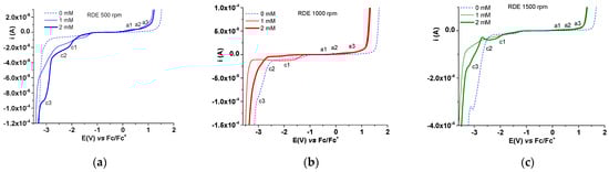 Figure 15 shows the RDE curves for different electrode rotation rates at three concentrations of 4b (0.5 mM, 1 mM, 2 mM). The obtained curves support the hypothesis of film formation at the potential of the process c2. At this highest concentration value (2 mM) and at the highest rotation rate (1500 rpm) the most obvious current decrease occurs for the c2 process. This can be attributed to a reduction process with film formation.