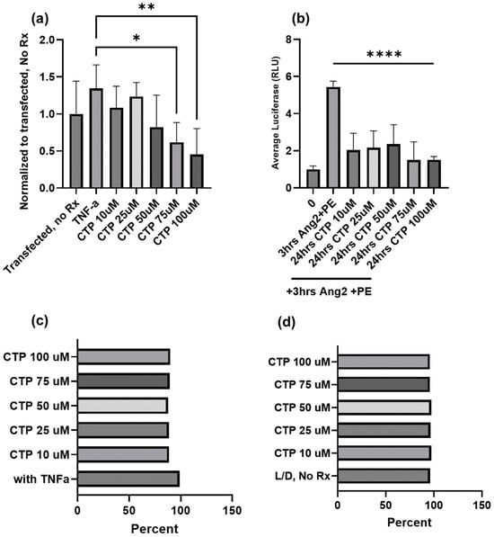 Inhibition of TNF-α mediated NF-κB activation by CTP in a human cardiomyocyte cell line at the baseline (a) and after angiotensin/phenylephrine challenge (b). No change in cell viability due to either treatments with CTP (c) or treatments with CTP after an angiotensin/phenylephrine challenge (d) as assessed by FACS using live/dead stain. *: p < 0.05, **: p < 0.01, ****: p < 0.0001.