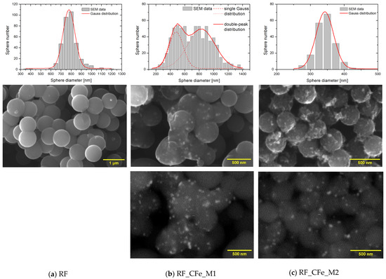 Activation of carbon spheres using potassium oxalate leads to the formation of material where double, triple, and even more spheres are not separated during the formation, which can be seen in Figure 4 for unmodified and modified material. The diameter of the spheres varies from ca. 400 to 1500 nm, for unmodified RF_PO and modified material (M1, M2), but the mean diameter for RF_PO is 592 ± 9 nm, while for M1 it is 662 ± 49 nm. The latter size distribution follows the Gaussian model, while in the case of the M2 method the distribution shows positive/right-asymmetry, with an elongated arm in the high value side. Enriching with iron citrate using M2 leads to the formation of spheres, but they were not separated from the carbon matrix, in which iron particles are also embedded. For this sample it was impossible to make a size distribution. Both methods (M1 and M2) allowed for the introduction of comparable amounts of iron into the material, 5.85 ± 0.82% and 6.22 ± 0.88%, respectively.